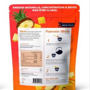 Finement moulu à partir des jeunes feuilles de thé vert les plus nobles, il est délicatement mélangé à de la poudre de mangue, de poudre d’ananas et à une touche de stévia naturelle, pour une expérience gustative à la fois fraîche, fruitée et raffinée.