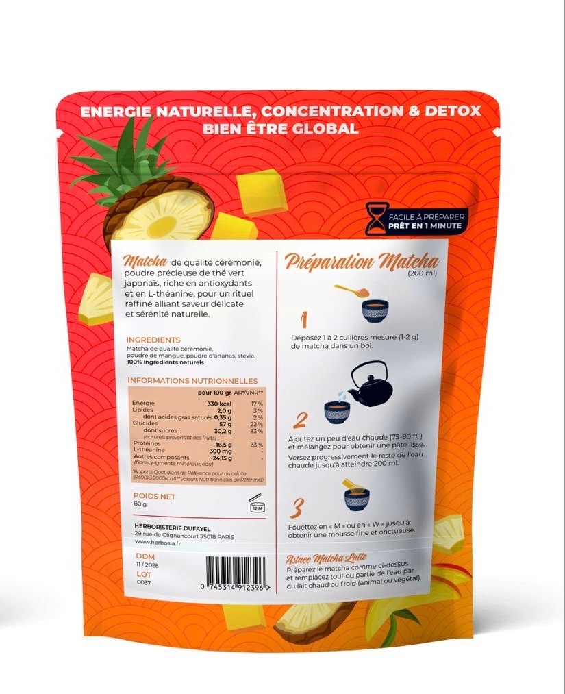 100 % naturel : matcha, mangue, ananas, stévia